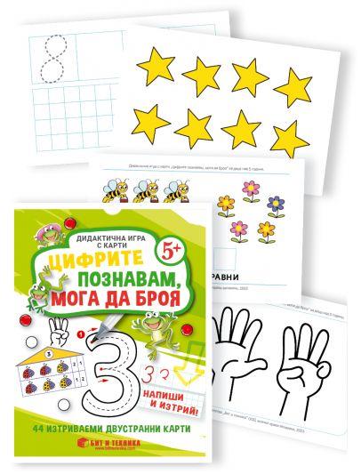 Комплект „Цифрите познавам, мога да броя“ с 44 изтриваеми двустранни карти за формиране на основни математически умения чрез забавни образователни игри. С него децата навлизат в света на математиката, като се упражняват да броят до 10, да определят количества и да ги сравняват, запознават се със състава на числата и с цифрите и тренират изписването им, научават се да свързват количество с цифра и да подреждат числовата редица в прав и обратен ред, тренират елементарни математически операции по прибавяне и отнемане.