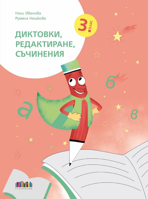 Помагалото „Диктовки, редактиране, съчинения за 3. клас“ е съoбразено с учебната програма по български език за 3. клас. Съдържа 14 теми, всяка от които е съставена от три компонента, важни за обучението по БЕЛ и за подготовката за НВО: