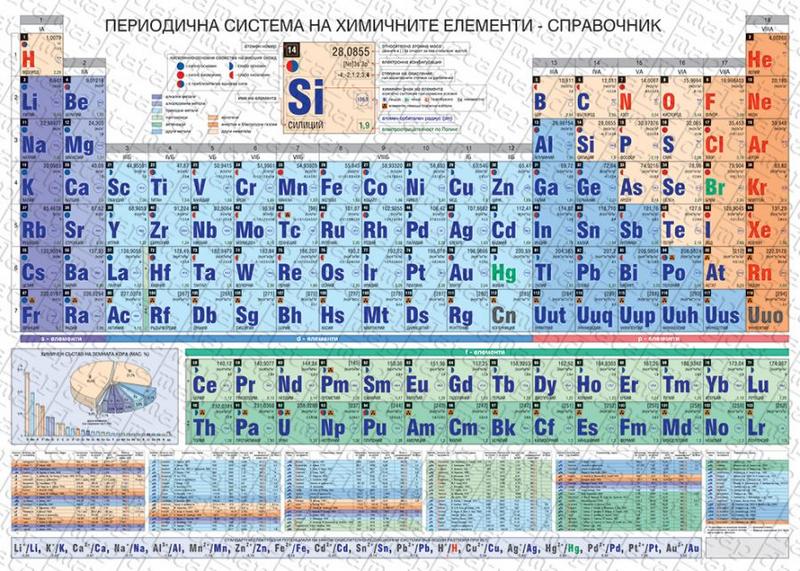 Стенна периодична система на химичните елементи с наименование, химичен знак, атомен номер, относителна атомна маса, електронна конфигурация, възможни степени на окисление, най-характерна степен на окисление, агрегатно състояние при нормални условия, радиоактивни свойства, киселинно-основни свойства на висшия оксид, атомен и йоннен (катионен или анионен) радиус, вандерваалсов радиус, ред на записване на елементите и др.