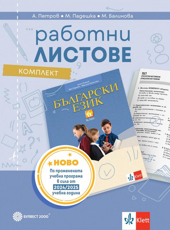 С Комплекта работни листове по български език за 6. клас учениците ще се справят по-добре при подготовката си за часовете по български език. Изданието дава възможност и за обогатяване на езиковата им култура, за развитие на компетентностите им за пълноценно и резултатно речево общуване.