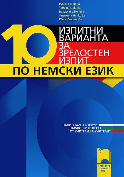"10 изпитни варианта за зрелостен изпит по немски език" на издателство "Просвета" е разработено от изтъкнати учители от цялата страна, след участие в националния конкурс "Най-добрите десет. От учители за учители". В помагалото ще откриете десет комплексни теста, които съдържат всички елементи, включени в зрелостния изпит по немски език. Учителите са подбрали разнообразни текстове, не само познавателни и съдържащи важна информация, но и любопитни, и забавни, за да задържат интереса и вниманието на учениците докрай.