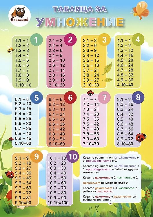 - Таблица за умножение с числата от 1 до 10 включително; когато единият от множителите: е 0, 1; когато делимото е 0; когато делителят е 1; когато делимото и делителят са равни.