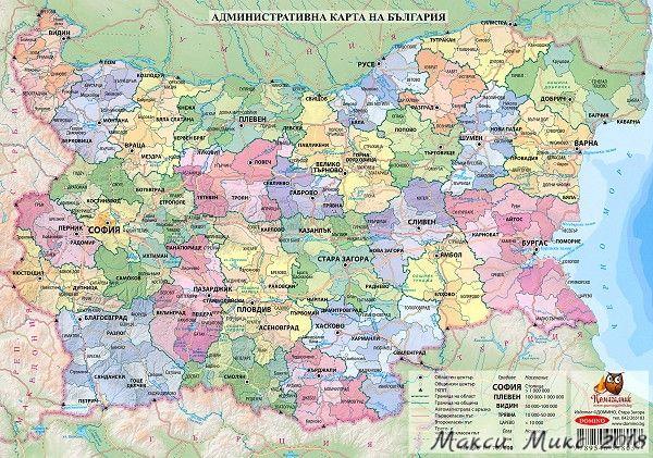 - Административни области и общини в България (с обозначени областни и общински центрове и граници).