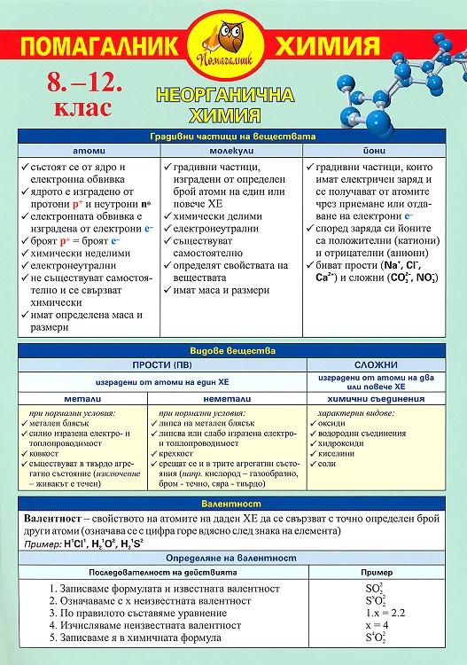 - Химични елементи: с метален, с двойствен, с неметален химичен характер. Киселини (наименование, химична формула, наименование на солите, валентност на киселинната група). Основи. Хидриди. Соли.