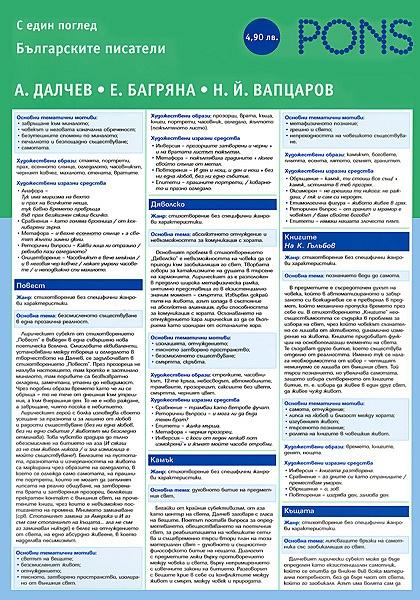 В удобен формат А4 на 6 страници ще намерите цялата информация за живота, творчеството и ключовите произведения на Атанас Далчев, Елисавета Багряна, Н.Й.Вапцаров. Универсално помагало за ученици, студенти и преподаватели за учене, преговор и бърза справка.