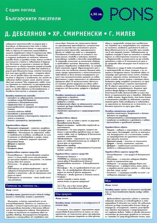 В удобен формат А4 на 6 страници ще намерите цялата информация за живота, творчеството и ключовите произведения на Димчо Дебелянов, Христо Смирненски и Гео Милев. Универсално помагало за ученици, студенти и преподаватели за учене, преговор и бърза справка. |