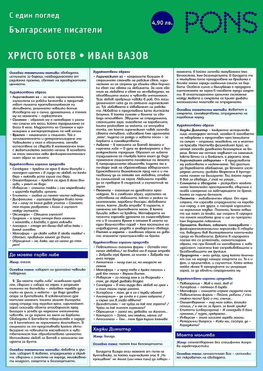 В удобен формат А4 на 6 страници ще намерите цялата информация за живота, творчеството и ключовите произведения на Христо Ботев и Иван Вазов. Универсално помагало за ученици, студенти и преподаватели за учене, преговор и бърза справка.