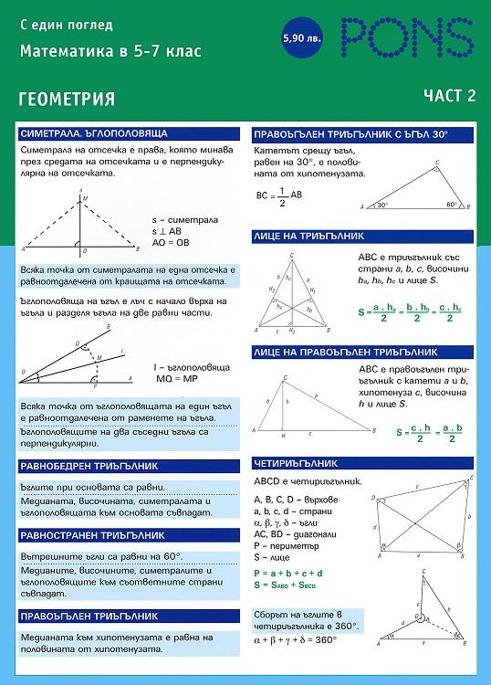 Помагалото по геометрия "Математика с един поглед" е предназначено за ученици от 5. клас, 6. клас и 7. клас. То е под формата на диплянка във формат А4 с 6 ламинирани страници. |