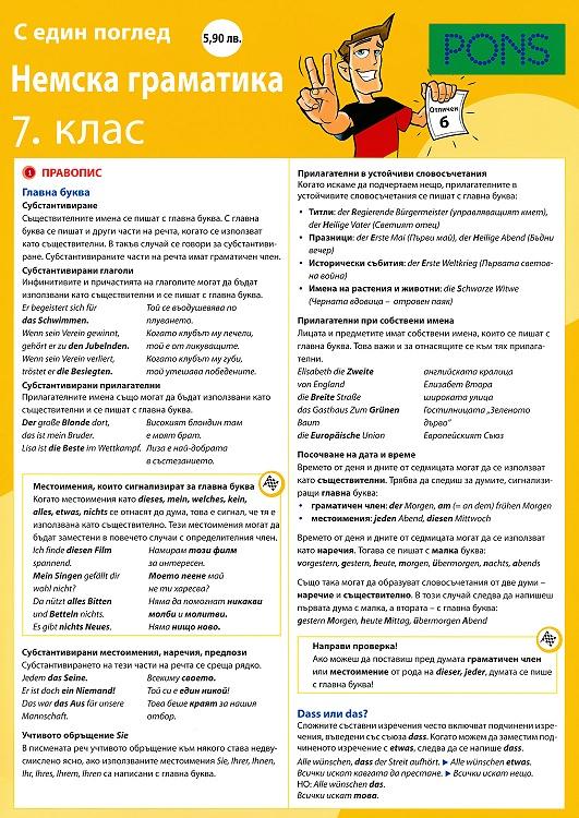 На 6 страници формат А4 е представена немска граматика, включена в учебните планове за 7. клас на МОМН. Правилата са обяснени на достъпен език и онагледени от примери и таблици, превръщайки помагалото в отличен справочник за учениците. |