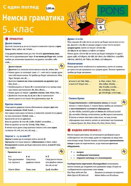 На 6 страници формат А4 е представена немска граматика, включена в учебните планове за 5. клас на МОН. Правилата са обяснени на достъпен език и онагледени от примери и таблици, превръщайки помагалото в отличен справочник за учениците. |