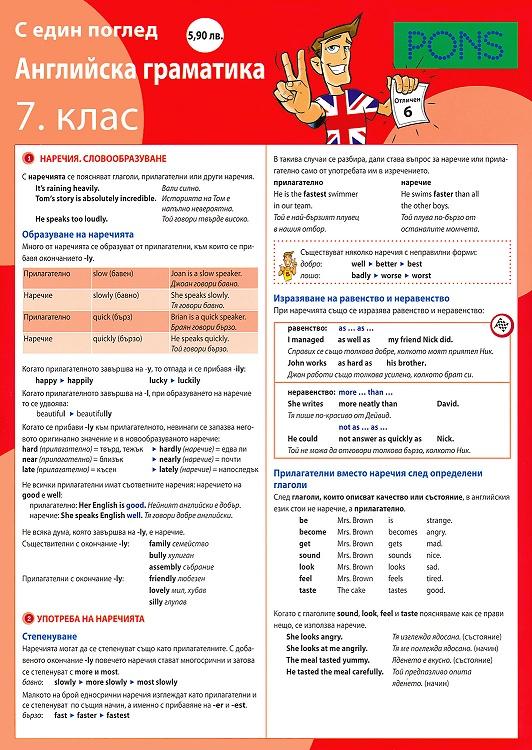 Отличен справочник за учениците в 7. клас, които искат бързо и лесно да овладеят английската граматика. Правилата са обяснени на български език и онагледени от примери и таблици, а практичният формат от 6 страници А4 правят помагалото незаменим помощник по английски език. |