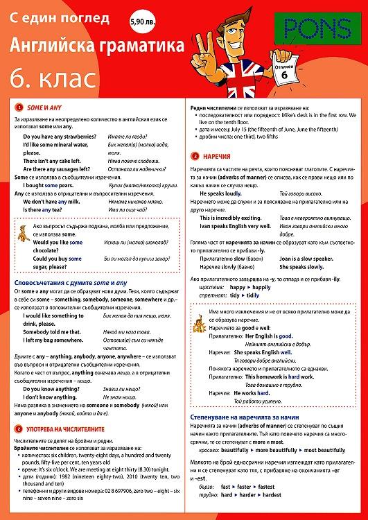 Английската граматика, залегнала в учебните планове на МОМН за 6. клас, събрана на 6 страници формат А4. Практично и полезно помагало с много примери и допълнителни разяснения на български. |