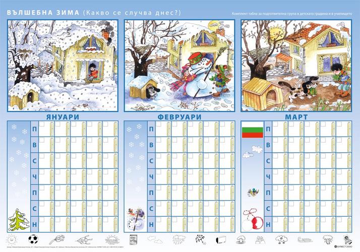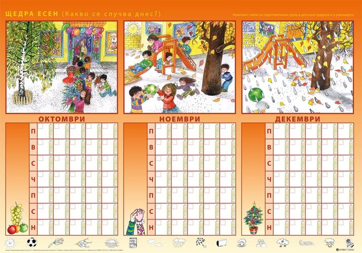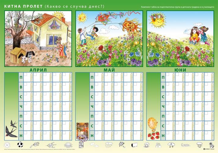 Другите четири табла осигуряват фронталната работа по дейности, предвидени в програмната система по образователни направления Природен свят и Социален свят, но могат да бъдат използвани и по темите от направление Математика. Те дават възможност на учителя и децата да оформят природен календар на групата, чрез които да се систематизират представите за промените в природата през различните сезони, месеци и дни. В календара има възможност да се отразяват и явления от неживата природа. Календарът може да се използва и за развиване на умения за ориентиране в празнично обредната система на страната. |