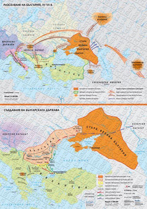 Съдържа: географска мрежа; хидрография; територията на Стара Велика България, територии населени с българи, славяни и др. съседни територии и държави, представени чрез фоново оцветяване и щриховка; посоки на разселване на българите; походи на хазарите; надписи на хидрография, държави, племена и др.; легенда. Създаване на Българската държава. Съдържа: географска мрежа; хидрография; територията на Стара Велика България, територията на България при хан Аспарух, територия присъединена от хан Тервел, територия на Византия и др. съседни територии, представени чрез фоново оцветяване; военни походи на българи и византийци; столици и градове; надписи на хидрография, племена и др.; легенда. Картата е размер 140 х 100 см. Двустранно ламинирана. |
