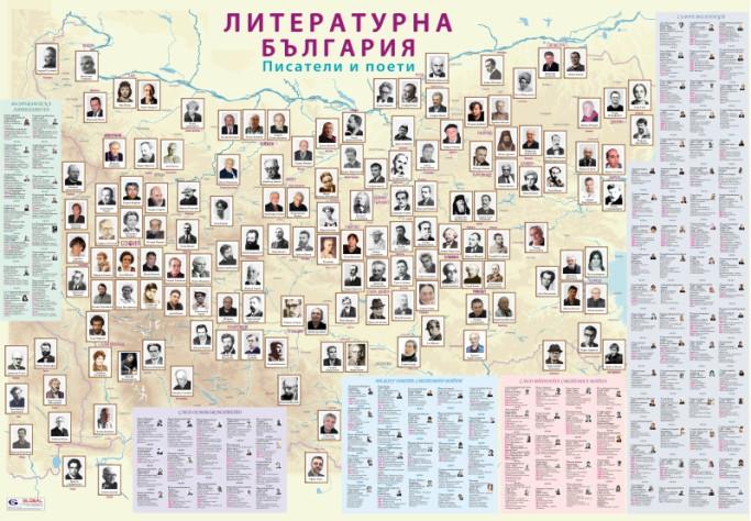 Стенна ламинирана карта с размери 140 х 100 см. Показани са над 130 известни български автори по месторождението им. В таблица е представена енциклопедична справка за всеки един автор. |