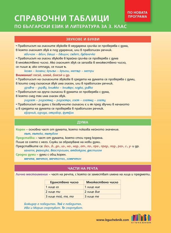 В таблиците е представено най-важното от учебния материал по български език и литература за 3. клас. Помагалото е създадено по новата учебна програма и може да се използва с всички одобрени учебници. |