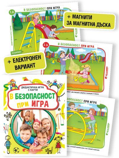 Комплектът с 22 образователни карти запознава децата с основни правила за безопасност при игра и съдейства за изграждане на базови навици за безопасно поведение извън дома. Правилното и неправилното поведение в дадена ситуация от ежедневието се онагледява чрез двойка илюстрации. Те провокират децата да обсъждат, откриват и обясняват къде и защо не бива да се играе, какво е опасно да се прави на детската площадка, как да се държим при среща с непознати хора и животни, какво може да се случи и кой помага при беда. В разговор и чрез игра децата разбират, че не всяко забавление е безопасно, и научават как да пазят себе си и околните. Комплектът може да се използва от родители и педагози за индивидуална, партньорска и групова работа на деца от всички възрастови групи в детската градина. Приложим е в обучителния процес по околен свят. Подходящ е и като нагледен материал за фронтална работа благодарение на включените в него магнити за закрепване върху магнитна дъска. Комплектът съдържа код за достъп до интерактивни упражнения, които ще направят заниманията още по-интересни. |