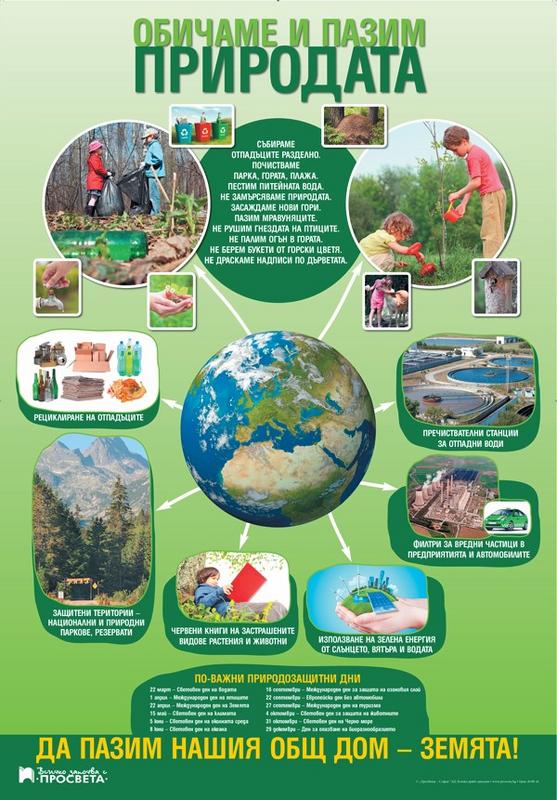 „Да пазим нашия общ дом – Земята” не е просто лозунг, а жизнена необходимост за всяко човешко същество на планетата в наши дни. Таблото представя синтезирано основните опори на екологичното възпитание на учениците в началния етап. Чрез чудесни цветни снимки и текст то не само формира отговорно отношение у децата към природата, а ги насърчава да участват в достъпни дейности за опазването ѝ – да почистват училищния двор и парка, да пазят горите и да засаждат растения, да събират разделно отпадъците, да пестят питейната вода. Таблото запознава учениците и с усилията на международната общност в глобален мащаб:
