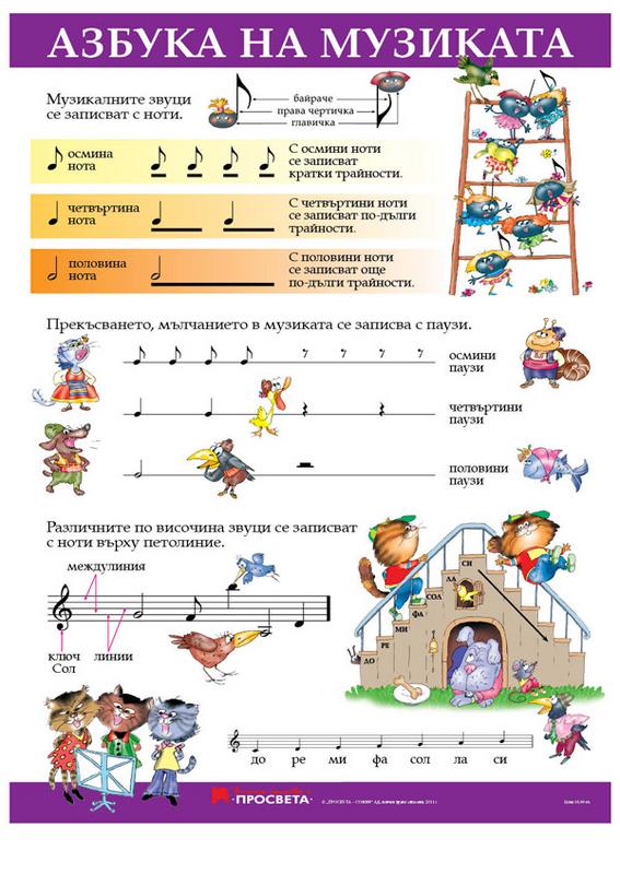 Съдържа основни знаци на нотописа за тонови височини и трайности. Може да се използва независимо от избрания учебник.