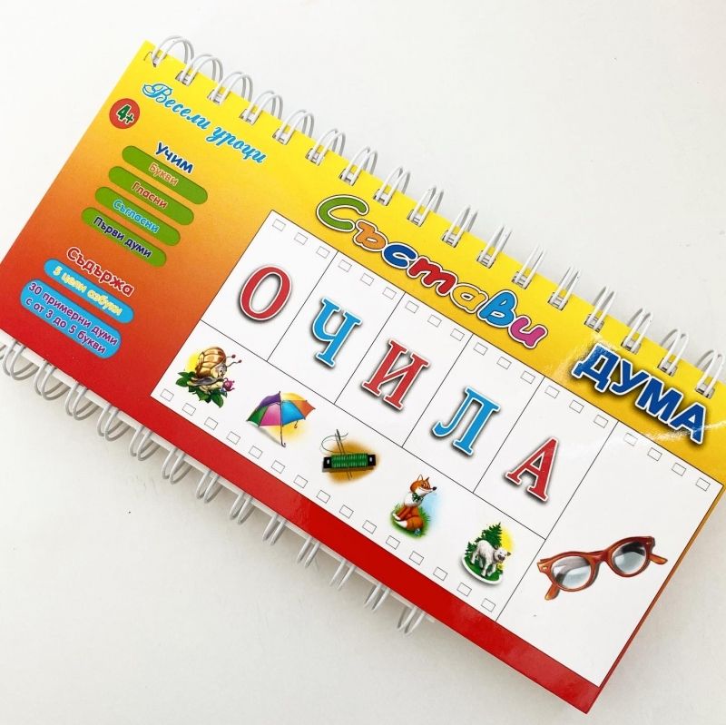 Забавен начин за учене на букви и думи. Книжката се състои от шест колонки, като първите пет от тях съдържат цялата азбука, а шестата - картинка с готовата дума. Под буквите има картонче с картинки. Намерете първите букви на картинките и ще съставите дума |