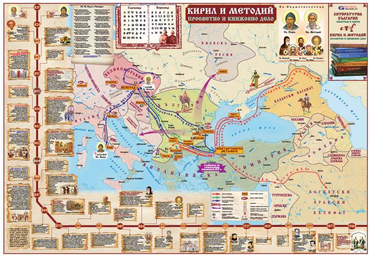 Представя известни български писатели и поети на картата на България. От другата страна е историческата карта Кирил и Методий – просветно и книжовно дело. Размери 70 х 100 см. Стенно двустранно ламинирано табло с лайсни. |