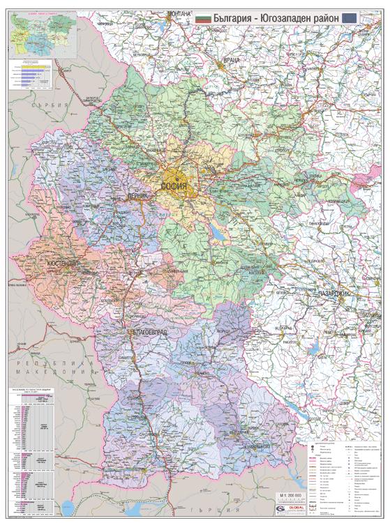 Стенна ламинирана карта на Югозападен район. М 1:200 000, размери около 100 х 130 см. Включва областите Благоевград, Кюстендил, Перник, София и София-град. |