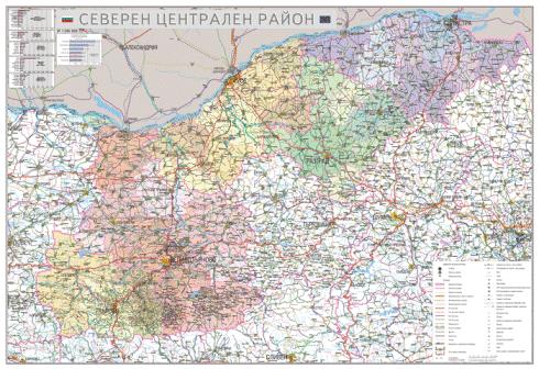 | Стенна ламинирана карта на Северен централен район. М 1:200 000, размери около 95 х 130 см. Включва областите Велико Търново, Русе, Габрово, Разград и Силистра.
